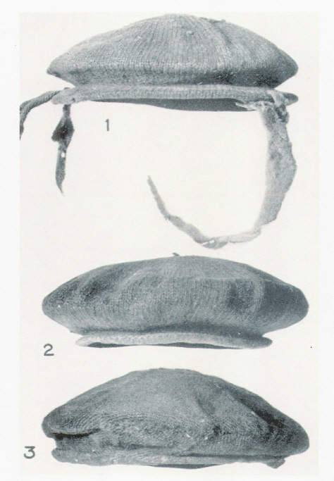 Below are three period examples of early Scottish caps from the National Museum of Antiquities of Scotland. The historian John Telfer Dunbar describes them a follows: “The first came from Dara Moor in Morayshire and is knitted, and an unusualunusual feature is the two strings, one on each side, which were tied under the chin. The second cap or bonnet was dug up in Tarvie in Ross-shire and to is knitted, in this case in green wool. It has little slits just below the edge of the crown into which a brooch could have been fitted. The third specimen, excavated at Barrock, in Caithness, is made of dark brown cloth. This one has a small triangular vent in the head-band at the back which has been overlapped to fit the wearer and then stitched up.”(1)